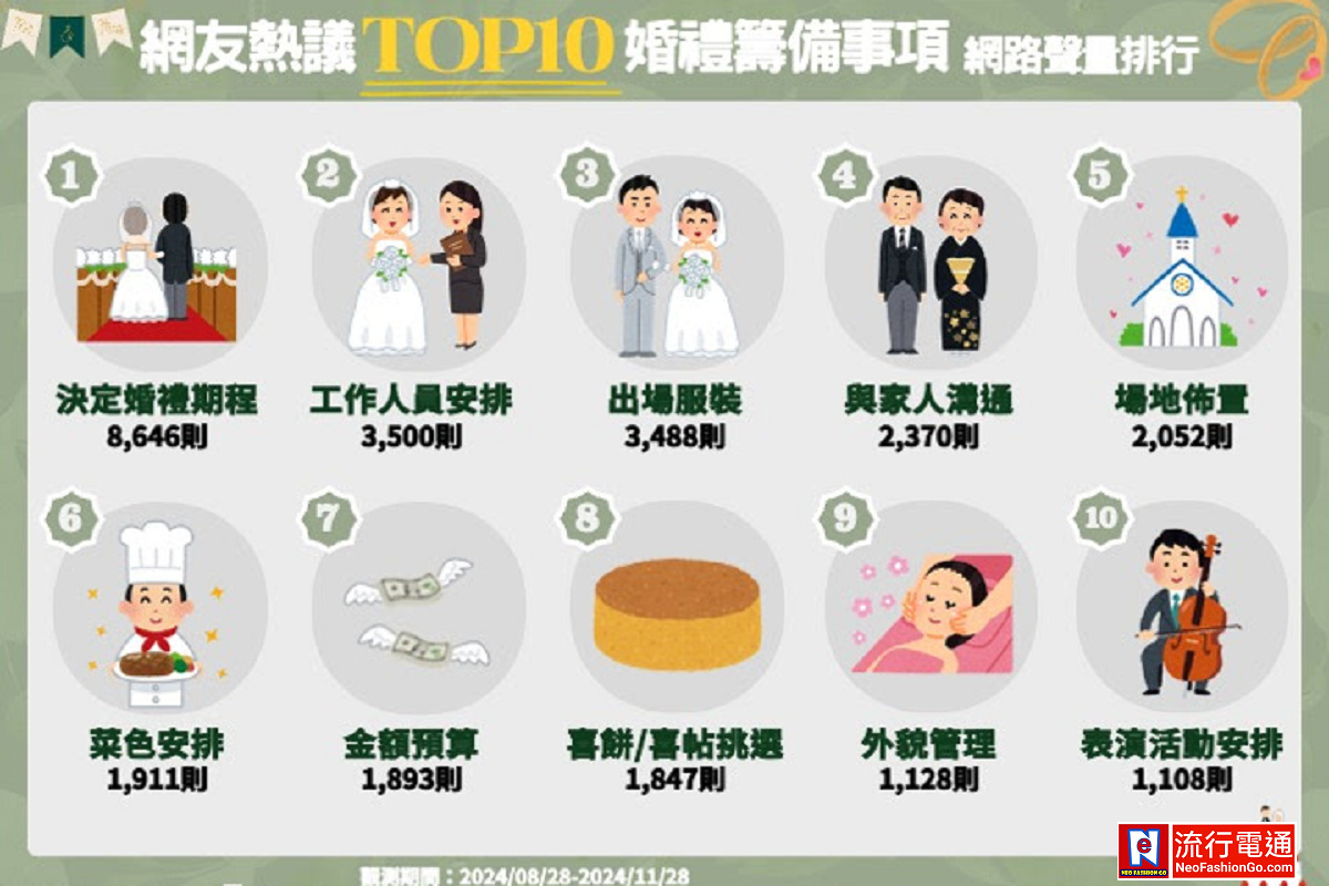 【應瑋漢 cwnkent88@gmail.com】與心愛的伴侶攜手走入婚姻殿堂,可說是人生中最重要的時刻之一,因此許多人都希望能將自己的婚禮辦得盡善盡美,讓新人與出席見證的親友們都能留下難忘回憶。但在走上紅毯前,籌備一場婚禮的過程可能需要長達三個月至一年的時間,網友直言「決定要辦婚禮之後,才發現其實好多事情要準備」,從場地選擇至婚禮流程,每個環節都不能馬虎。其中又有哪些籌備事項引發最多網友討論呢?讓我們一起來一探究竟吧!《Social Lab社群實驗室》本次透過《OpView社群口碑資料庫》追蹤近三個月「婚禮籌備事項」話題的網路聲量表現,帶您了解網友熱議的10大婚禮籌備事項。觀察近三個月網友針對「婚禮籌備事項」的討論,可以發現「決定婚禮期程」是最受關注的環節,籌備一場婚禮如同策劃一場活動,從地點、日期到形式等每個細節都至關重要。「地點」往往是新人們最優先考量的項目,因為「如果要挑好日子一定是一年前就須開始確定地點」。此外,婚禮形式也因人而異,無論是中式、西式、簡單或是奢華等形式,都能帶來不同的感受,如有網友舉辦「野餐市集婚禮」,「讓大家在戶外悠閒的野餐」、「聽歌手演唱」及「逛逛市集」,認為這樣反而能讓新人「有大把時間跟親友聊天拍照」,而另一位網友更結合中式的文定儀式與西式宴客,同時滿足自己與長輩的期待。對於該選擇什麼婚禮形式,有網友表示「辦什麼形式的婚禮其實夫妻開心最重要」。
